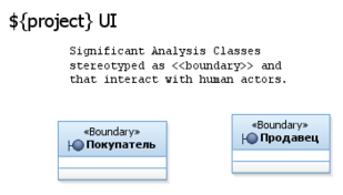 для класса граничного: атрибуты — элементы формы (на основе эскиза пользовательского интерфейса) или параметры протокола, методы — управляющие сигналы от пользователя (обработчики событий),