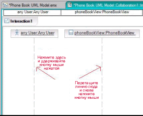 Выберите Asynchronous Message в панели Palette.Как показано на рисунке 11, нажмите кнопку мыши на линии под элементом any User: Any User. Удерживая кнопку мыши нажатой, перетащите линию под элемент phoneBookView:PhoneBookView: