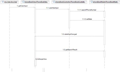 В этом разделе будет реализован прецедент "Search for a phone number" и показано связанное взаимодействие с использованием циклограммы. Прецедент запускается действующим лицом Any User, использующим интерфейс, предоставленный классом PhoneBookView, для запроса на поиск. Класс PhoneBookView уведомляет класс PhoneBookController о запросе пользователя. PhoneBookController затем обновляет модель данных, хранимую в классе PhoneBookModel. Так как модель изменена, класс PhoneBookModel уведомляет PhoneBookView, который затем обновляет пользовательский интерфейс в соответствии с последним состоянием приложения.