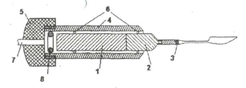 Конструкция акустического узла приведена ниже. Магнитостриктор 1 с приклеенным к нему концентратором 2 образует акустическую головку, которая с помощью демпфирующих резиновых колец 6 закрепляется в цилиндрическом кожухе 4.