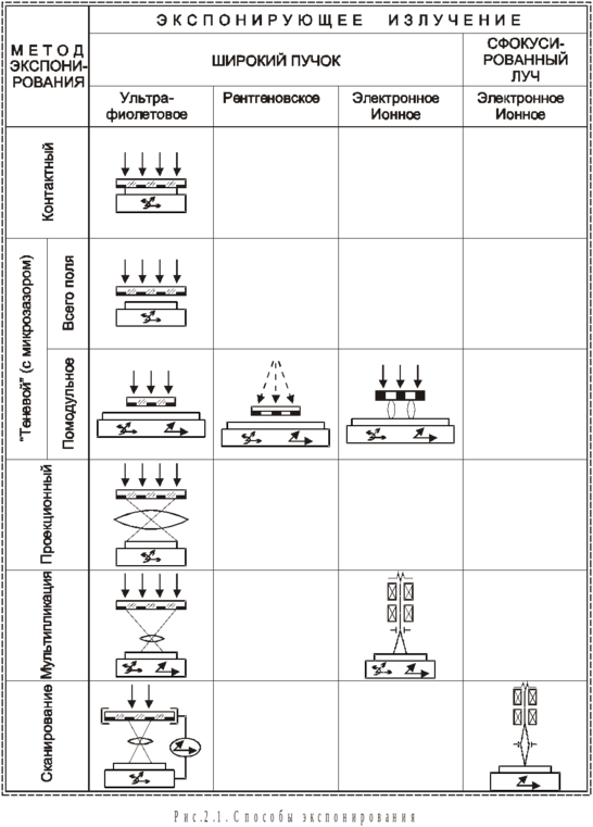 Для примера рассмотрим оборудование для формирования изображений на полупроводниковой пластине. Технологический процесс включает в себя операцию совмещения ранее нанесённого рисунка с вновь создаваемым рисунком и операцию экспонирования0. Операцией, определяющей тип оборудования, является процесс экспонирования. Он может быть ориентирован на один из видов формирования потока излучения (рис.2.1): широким пучком или сфокусированным лучом.