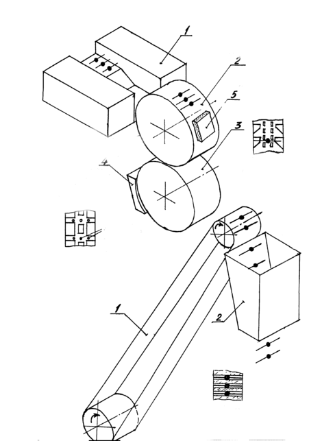 Полностью собранные диоды высыпаются из межоперационной тары (емкость 1200…2500 шт.) в горизонтальный лоток-транспортер на постоянных магнитах (рис.3.7 и 3.8). Магнитный лоток состоит из двух блоков 1, набранных из постоянных магнитов, причем плоскости, образованные их одноименным полюсами, сходятся по мере приближения к транспортирующему барабану 2, выполняющему функцию МПВ. Переменное расстояние между блоками 1 создает градиент магнитного поля в направлении барабана, к которому под действием поля перемещаются диоды. При этом диоды с ферромагнитными проволочными выводами ориентируются поперек вектора перемещения и сохраняют интервалы между собой и дном лотка. Дойдя в конце лотка до вращающегося барабана 2, имеющего строенный по внешнему ободу магнитопровод, диоды фиксируются в пазах обода (материал обода –капролон) и таким образом переносятся к магнитному экрану 5, функция которого, - изъятие из транспортного потока дефектных диодов с сильно деформированными выводами, не подлежащими дальнейшей обработке (экран периодически очищается вручную от налипших диодов).
