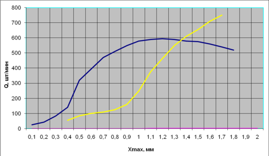 Из графиков следует, что при амплитуда Х = 1,2мм производительность составляла около 300 шт/мин. Дальнейшее увеличение амплитуды колебаний лотка не приводило к увеличению производительности, а даже снижало ее. Падение производительности обьяснялось интенсивным подбрасыванием заготовок при движении, их соударениям и сбрасыванию с лотка.