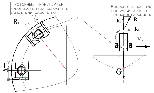 Обозначения сил, действующих на заготовки: J – сила инерции при сьеме заготовки с опорного штыря; Fn – сила инерции при движении на рабочем (транспортном) роторе; Fтр –сила трения о опорный штырь; R (Rв, Rг) – аэродинамическая сила всасывания пневмовихревым захватом; Vтр – линейная скорость подачи заготовки ротором в зону захвата.