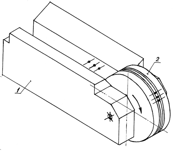 Полностью собранные диоды высыпаются из межоперационной тары (емкость 1200…2500 шт.) в горизонтальный лоток-транспортер на постоянных магнитах (рис.3.7 и 3.8). Магнитный лоток состоит из двух блоков 1, набранных из постоянных магнитов, причем плоскости, образованные их одноименным полюсами, сходятся по мере приближения к транспортирующему барабану 2, выполняющему функцию МПВ. Переменное расстояние между блоками 1 создает градиент магнитного поля в направлении барабана, к которому под действием поля перемещаются диоды. При этом диоды с ферромагнитными проволочными выводами ориентируются поперек вектора перемещения и сохраняют интервалы между собой и дном лотка. Дойдя в конце лотка до вращающегося барабана 2, имеющего строенный по внешнему ободу магнитопровод, диоды фиксируются в пазах обода (материал обода –капролон) и таким образом переносятся к магнитному экрану 5, функция которого, - изъятие из транспортного потока дефектных диодов с сильно деформированными выводами, не подлежащими дальнейшей обработке (экран периодически очищается вручную от налипших диодов).