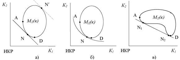 Графически в пространстве показателей качества применение целевой функции означает поиск точки касания N границы множества допустимых решений с линией, задаваемой этой функцией, при параллельном ее смещении от начала координат (если функция цели минимизируется) или из бесконечности к началу координат (если функция максимизируется). На рис. 8 сказанное поясняется на примере двухкритериальной задачи с непрерывным множеством допустимых решений Мд(к).