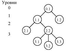 Иерархическая структура объектов-систем часто изображается в виде дерева, т.е. графа без замкнутых маршрутов, с расположением вершин по определенным уровням, например, как показано на рис.5. Вершина верхнего уровня (на рисунке — 0) называется корнем.