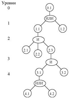 Граф, представленный на рис.5, соответствует И-дереву: вершины, которые расположены на одинаковых уровнях, являются обязательными элементами вышерасположенных систем (так, для вершины 0.1 обязательные элементы — 1.1, 1.2, а для вершины 2.2 — 3.1, 3.2 и 3.3. Например, автомобиль состоит из двигателя, И кузова, И шасси).