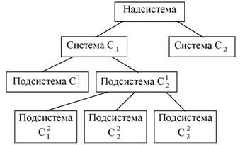 Иерархическая структура может быть изображена в виде ветвящейся блок-схемы, на подобие представленной на рис.4. Здесь на нулевом уровне располагается исходный объект-система С1, на следующих уровнях — его подсистемы (число уровней и количество подсистем, показанных на рисунке, выбрано произвольно). С целью получения более полного представления о системе и ее связях в структуру включают надсистему и составляющие ее части (системы нулевого уровня, например, вторая система С 2).