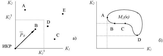 На рис. 7а показан пример множества из пяти допустимых решений Мд(к)= { PA, PB, PC, PD, Pe }= {Pj} в пространстве двух критериев {К1 , К2} (вектора решений, за исключением PB , на рисунке не показаны). Каждому решению Pj соответствует свой набор критериев, т.е. Pj={Кij}. Множество допустимых решений может быть дискретным (рис. 7а), либо непрерывным (рис. 7б).