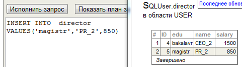 В среде Cache` Портал (раздел SQL, пакет USER) продемонстрировать выполнение SQL оператора INSERT для добавления объекта производного класса «В» с указанием значений всех полей.