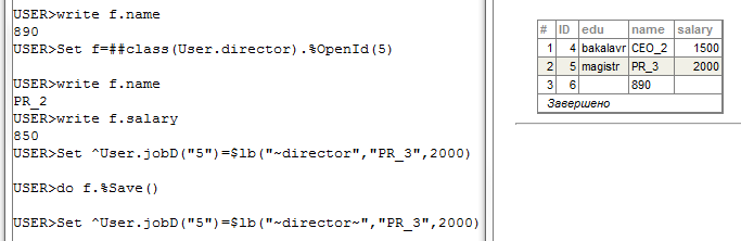 В среде Cache` Terminal на языке Cache` Object Script открыть объект (по варианту) (метод %OpenId()), просмотреть и изменить связанный с ним объект (по варианту), используя точечную нотацию, и сохранить в базе данных (метод %Save()).