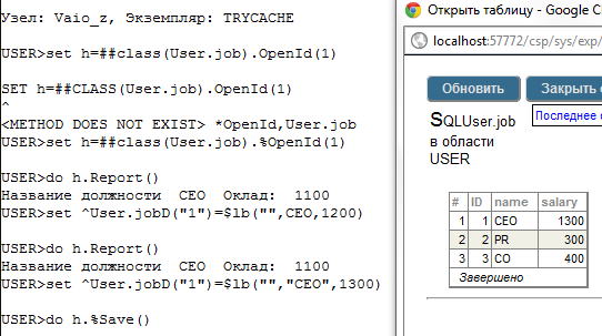 В среде Cache` Terminal на языке Cache` Object Script открыть объект класса «А» (метод %OpenId()), просмотреть и изменить значения его полей (используя точечную нотацию) и сохранить в базе данных (метод %Save()).