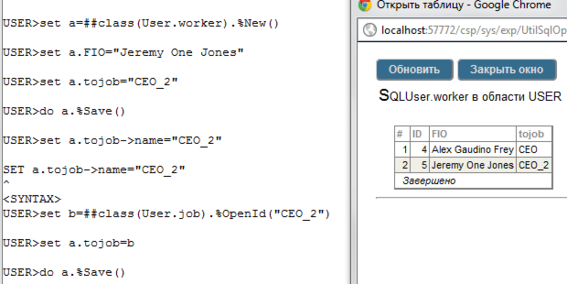 В среде Cache` Портал (раздел SQL, пакет USER) продемонстрировать выполнение SQL оператора UPDATE для изменения связанных объектов (по варианту).