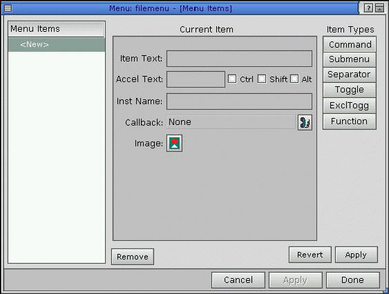 8. Теперь добавим пункт Quit. Нажмем командную кнопку, затем определим Quit как текст пункта и file_quit как имя обработчика.