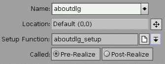 7 В поле Setup Function, напечатаем установку aboutdlg. Это - имя, которое мы даем функции установки, которую будем вызывать прежде, чем диалог реализован. Используя эту функцию, мы изменим содержание виджета метки в пределах диалога, чтобы отобразить номер версии.
