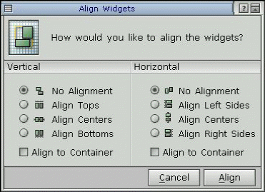 7. Выравняем по центру виджеты горизонтально в диалоге. Выберем PtLabel виджет и PtButton виджет, выберите Align из меню Widget, и затем выберите Alignment Tool из подменю. Вы будете видеть диалог выравнивания Виджетов: