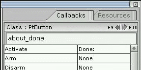 6. Выбираем виджет PtButton и изменяем его ресурс текста кнопки на Done. Тогда измените его имя образца на about_done.