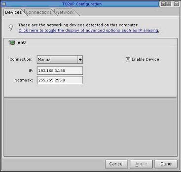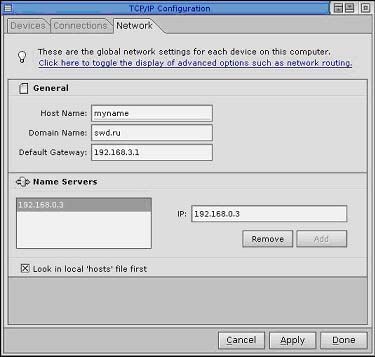 Для нормальной работы необходимо выполнить несколько простых операций. Если ЭВМ подключена к сети, то нам потребуется знать IP-адрес и сетевую маску нашей машины, IP-адреса шлюза и сервера имён. Если Вы системный администратор, то эти сведения Вам известны, в противном случае обратитесь к системному администратору. Заметим, что задать хотя бы имя хоста и его IP-адрес желательно даже для одиночного компьютера, потому что многие программы изначально рассчитаны для работы в сети и работают корректно только при наличии сетевых настроек (характерный пример - QNX IDE).