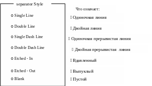 До сих пор Вы добавляли пункты меню командного типа. Теперь добавьте пункт типа разделитель. Просто щёлкните на кнопке "Separator" возле верхнего правого угла. Вы увидите список стилей разделителя: