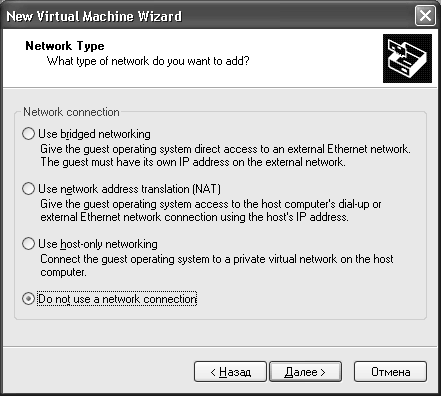 • Do not use a network connection (Не использовать сетевое соединение) — в конфигурацию ВМ не включается сетевой адаптер, и она, соответственно, лишается возможности работать в сети.