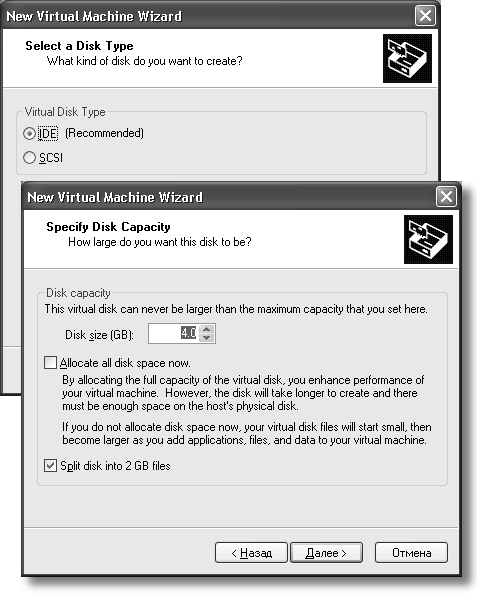 Установив переключатель Create a new virtual disk и щелкнув на кнопке Next, вы получите возможность выбрать тип интерфейса для создаваемого диска (рис. 3.20, вверху), а также установить его максимальный размер и способ выделения пространства под диск (рис. 3.20, внизу).