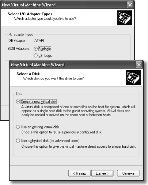 Первое из этих окон обеспечивает выбор типа адаптера (рис. 3.19, вверху). Второе окно позволяет указать, нужно ли создавать новый виртуальный диск (переключатель Create a new virtual disk) или подключить к ВМ один из имеющихся дисков (рис. 3.19, внизу).