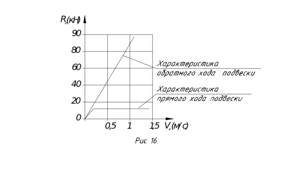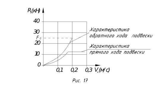Учитывая то, что сила на штоке амортизатора прямо пропорциональна квадрату скорости перетекания в нем жидкости, вышеуказанная характеристика будет неверной. Ее можно заменить на параболическую, учитывая то, что площади под соответствующими участками кривых должны быть равны (рис. 17).