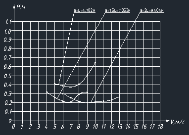 На рисунке 6 приведены скоростные характеристики машины для трёх длин периодической неровности: длина неровности равна базе машины, длина неровности равна полторы базы машины и длина неровности равна двум базам машины.