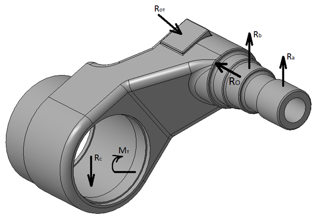 При расчете учитываются все силы, действующие на балансир: реакции в подшипниках верхней и нижней осей балансира, силы со стороны отбойника амортизатора и корпуса, крутящий момент от торсиона (рис. 3.7.1).