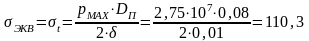не учитываем, поскольку, при действии давления внутри полости на стенки гильзы амортизатора, осевая составляющая сил давления действует на поршень, который не имеет жесткой связи с гильзой амортизатора, поэтому эквивалентное напряжение равно окружному: