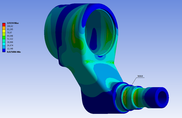 После построения объемной модели задаем внешние нагрузки и закрепления балансира. Верхней головке балансира запрещаем радиальное перемещение и прикладываем на месте шлицов момент торсиона. Нижней оси балансира запрещаем радиальное перемещение в местах установки подшипников. После вычисления получаем, что максимальные напряжения равны 503,41 МПа.