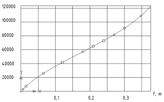 | f, м | 0,0056 | 0,016 | 0,0648 | 0,12 | 0,18 | 0,21 | 0,24 | 0,27 | 0,3 | 0,348 | 0,377 |