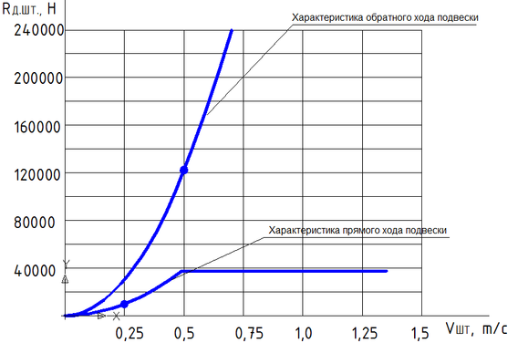 Площадь поперечного сечения дроссельного отверстия (эквивалентный диаметр) определим из условия равенства демпфирующей силы на штоке, определяемой по вышеприведенным формулам, и силы, взятой с построенной демпфирующей характеристики амортизатора при той же скорости.
