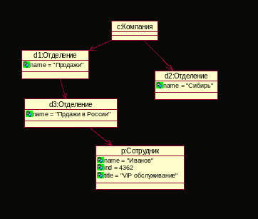 Диаграммы объектов (Object diagram) – представляет объекты и отношения между ними. Является «фотографией» сущностей, показанных на диаграмме классов.
