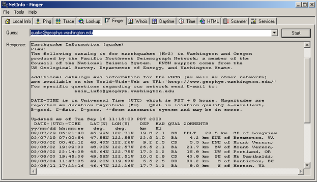 Запрос Finger также отображает всю информацию, содержащуюся в файлах .plan или .project в корневой директории. Эти файлы часто используются как простой путь для хранения информации. Например, сервер Finger на quake@geophys.washington.edu выдаёт систематизированную по датам информацию о землетрясениях, которые происходили в северо-западном регионе Соединённых Штатов(..must die, nah..)