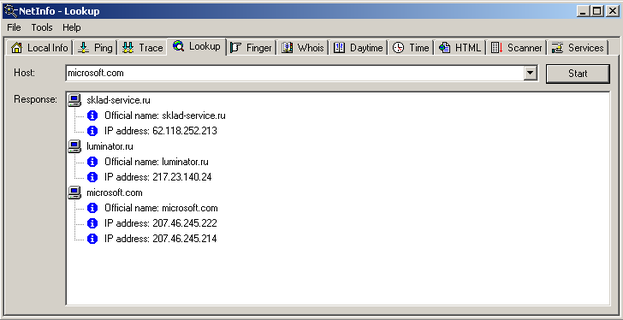 Примечание: Для Lookup необходима связь с сетью имеющей DNS или WINS сервер или какой-нибудь другой сервер имён. Ваш компьютер должен быть сконфигурирован для доступа к DNS.