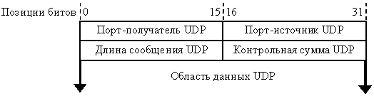 Длина UDP-заголовка - восемь байтов. Поля портов состоят из 16-битных целых чисел, представляющих номера портов протоколов. Поле "порт-источник" содержит номер порта, которым пользуется приложение-источник данных. Поле "порт-получатель" соответственно указывает на номер порта приложения-получателя данных. Поле "длина сообщения" определяет длину (в байтах) UDP-дейтаграммы, включая UDP-заголовок. Наконец, поле "контрольная сумма", в отличие от контрольной суммы IP-заголовка, содержит результат суммирования всей UDP-дейтаграммы, включая ее данные, область которых начинается сразу после заголовка.