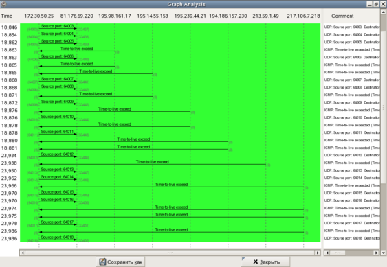 Программа предоставляет пользователю набор средств автоматизированного анализа полученной информации, среди которых инструмент Flow Graph (меню Statistics). Он позволяет построить диаграмму перемещения пакетов по узлам.. На рис.22 представлен пример такой диаграммы, полученный по результатам анализа работы утилиты traceroute.