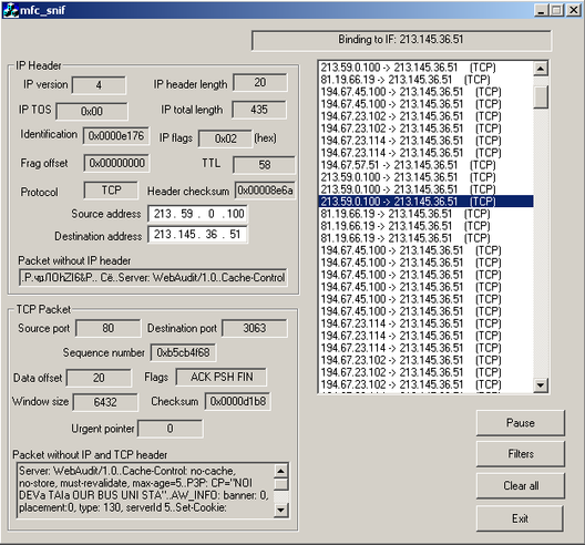 Пакетный анализатор MFC-snif позволяет различать основные протоколы стека TCP/IP, такие как IP, ICMP, IGMP, TCP, UDP и некоторые другие, и выводить информацию, содержащуюся в заголовках и полях данных протоколов. Существует возможность установки фильтров на входящий трафик (только ICMP; ICMP и UDP; ICMP, UDP и TCP и т.п.).