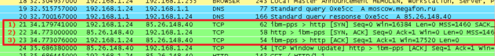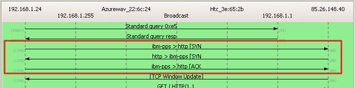 1 пакет: от нас к серверу, сегмент с флагом SYN, портом получателя (80) и исходящим портом (1376);