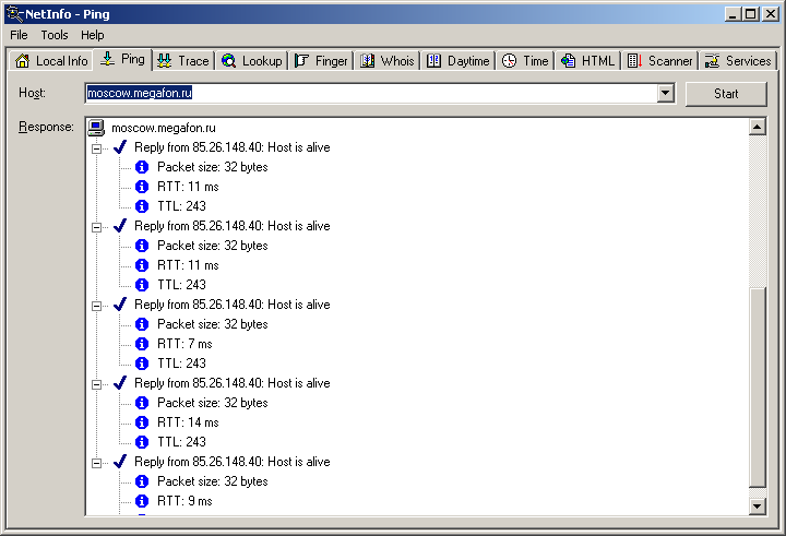 Пинг хоста мегафон.рф оказался невозможен, так как приложение, по-видимому, использует стандартные утилиты ОС Microsoft Windows, а там с кириллицей всё непросто. Потому в качестве хоста было взято доменное имя moscow.megafon.ru.