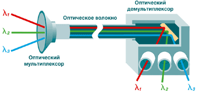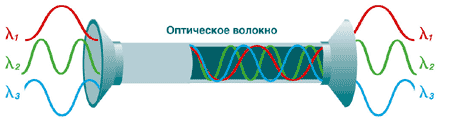 Как это происходит? Подобно тому, как видимый человеческим глазом свет состоит из различных цветов, на которые можно его разложить, а затем опять собрать, так и передаваемый по технологии DWDM световой поток, состоит из различных длин волн (λ).