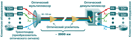 Принципиальная схема DWDM достаточно проста. Для того чтобы организовать в одном волокне несколько оптических каналов сигналы SDH «окрашивают», то есть меняют оптическую длину волны для каждого такого сигнала. «Окрашенные» сигналы смешиваются при помощи мультиплексора и передаются в оптическую линию. В конечном пункте происходит обратная операция - «окрашенные» сигналы SDH выделяются из группового сигнала и передаются потребителю.