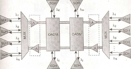 Оптические мультиплексоры ввода-вывода (Optical Add-Drop Multiplexer). OADM могут вывести из общего оптического сигнала волну определенной длины и ввести туда сигнал этой же длины волны, так что спектр транзитного сигнала не изменится, а соединение будет выполнено с одним из абонентов, подключенных к промежуточному мультиплексору. OADM может выполнять операции ввода- вывода волн оптическими средствами или путем промежуточного преобразования в электрическую форму. Обычно полностью оптические (пассивные) мультиплексоры ввода-вывода могут отводить небольшое число волн, так как каждая операция вывода требует последовательного прохождения оптического сигнала через оптический фильтр, который вносит дополнительное затухание. Если же мультиплексор выполняет электрическую регенерацию сигнала, то количество выводимых волн может быть любым в пределах имеющегося набора волн, так как транзитный оптический сигнал предварительно полностью демультиплексируется.