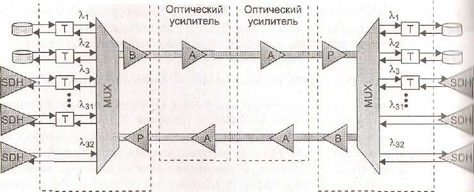 Практический успех технологии DWDM, оборудование которой уже работает на магистралях многих ведущих мировых операторов связи, во многом определило появление волоконно-оптических усилителей. Эти оптические устройства непосредственно усиливают световые сигналы в диапазоне 1550 нм, исключая необходимость промежуточного преобразования их в электрическую форму, как это делают регенераторы, применяемые в сетях SDH. Системы электрической регенерации сигналов весьма дороги и, кроме того, зависят от протокола, так как они должны воспринимать определенный вид кодирования сигнала. Оптические усилители, «прозрачно» передающие информацию, позволяют наращивать скорость магистрали без необходимости модернизировать усилительные блоки.