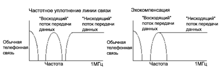 Технология ADSL использует частотное уплотнение линии связи (Frequency Division Multiplexing — FDM) (рис.). При FDM один диапазон выделяется для передачи «восходящего» потока данных, а другой диапазон (более широкий) для «нисходящего» потока данных. Диапазон «нисходящего» потока в свою очередь делится на один или несколько высокоскоростных каналов и один или несколько низкоскоростных каналов передачи данных. Диапазон «восходящего» потока также делится на один или несколько низкоскоростных каналов передачи данных. Кроме этого может применяться технология эхокомпенсации (Echo Cancellation), при использовании которой диапазоны «восходящего» и «нисходящего» потоков перекрываются и разделяются средствами местной эхокомпенсации.