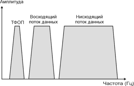 Технология ADSL (асимметричная цифровая абонентская линия) была разработана в Северной Америке в середине 1990-х годов. Она была разработана для предоставления таких услуг, которые требуют асимметричной передачи данных, например, видео по запросу, когда требуется передавать большой поток данных в сторону пользователя, а в сторону сети от пользователя передается гораздо меньший объем данных. При этом организуются три информационных канала — «нисходящий» поток передачи данных, «восходящий» поток передачи данных и канал обычной телефонной связи (ТФОП) (рис.). Канал телефонной связи выделяется с помощью фильтров, что гарантирует работу телефона даже при аварии соединения ADSL.