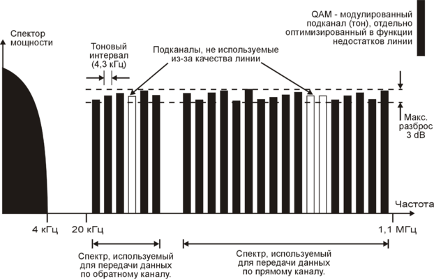 Исследования показали, что наиболее производительной является DMT, он и был принят в качестве стандарта для применения в ADSL.