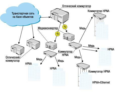 Одно из главных отличий первой версии HomePNA от второй заключается в более сложной архитектуре сети. Использование топологии "звезда" открывает простор для фантазии производителей сетевых устройств. В результате их ассортимент блещет небывалым для второй версии разнообразием. Если HomePNA 2.0 может похвастаться только конвертерами HomePNA/Ethernet, то для версий 1.0 и 1.1 выпускается множество моделей коммутаторов, поддерживающих стековое подключение, а значит, имеющих встроенных SNMP-агентов, умеющих выполнять преобразование LAN/WAN и организовывать VLAN. Стандартные схемы подключения домов и офисов к широкополосным коммуникациям с помощью HomePNA 1.0/1.1 показаны на рис. 3.